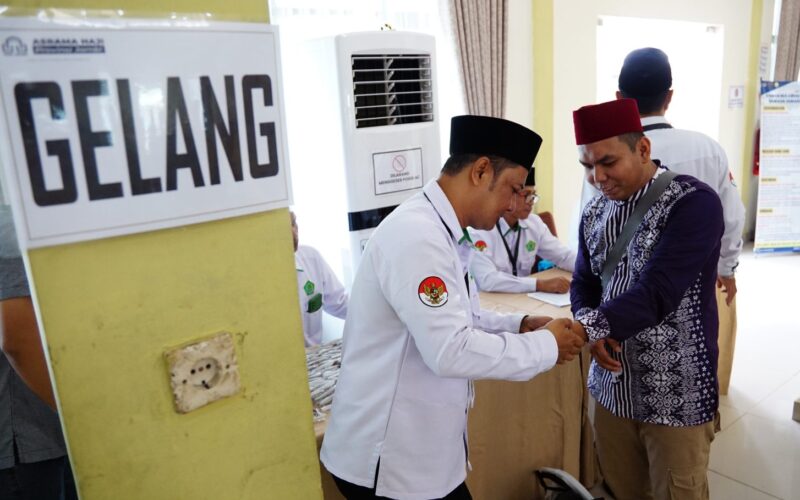 PPIH memasangkan gelang identitas kepada JCH Kloter BTH 13 saat tiba di Asrama Haji Jambi pada pelaksanaan ibadah haji tahun 2025, foto: sekitarjambi.com
