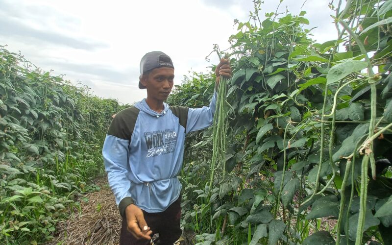 M Ardana memanen kacang panjang di lahan tanaman pangan di area gambut yang ia kelola dalam setahun terakhir.