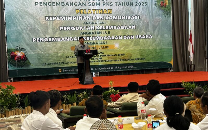 KILAS JAMBI – Badan Pengelola Dana Perkebunan (BPDP) dengan Balai Besar Pelatihan Manajemen dan Kepemimpinan Pertanian (BBPMKP) menggelar Program Pengembangan SDM Perkebunan Kelapa Sawit (PKS) tahun 2025, kegiatan diselenggarakan 18 hingga 28 Agustus 2025, di Swisbell Hotel Kota Jambi.